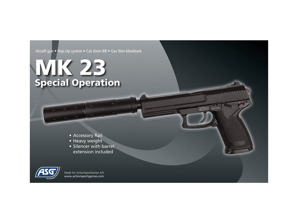 ASG:n valmistaja Mk23 replika on hienosti viimeistelty airsoft-versio aidosta MK23 pistoolista. Aseen liipasin on kaksitoiminen, joka tarkoittaa sitä, että liipaisinta painettaessa aseen vasara virittyy ja laukeaa samalla kertaa. Aseen luistia vetämällä aseen vasara on mahdollista virittää taka-asentoon jo valmiiksi liipaisun herkentämiseksi ja tarkempia laukausten ampumiseksi. Aseen luisti ei liiku muuten ammutaessa, jonka ansiosta MK23 on hiljainen ja kaasupihi kaasuase.