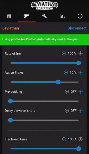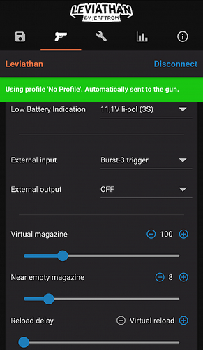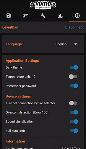 - Ohjelmoinnin asetukset tallentuvat reaaliajassa Leviathan - V2 muistiyksikköön. Toisin sanoen et menetä asettamiasi asetuksia, vaikka Bluetooth yhteys katkeaisi tai akku irroitettaisiin aseesta keskes yksikön säädön.