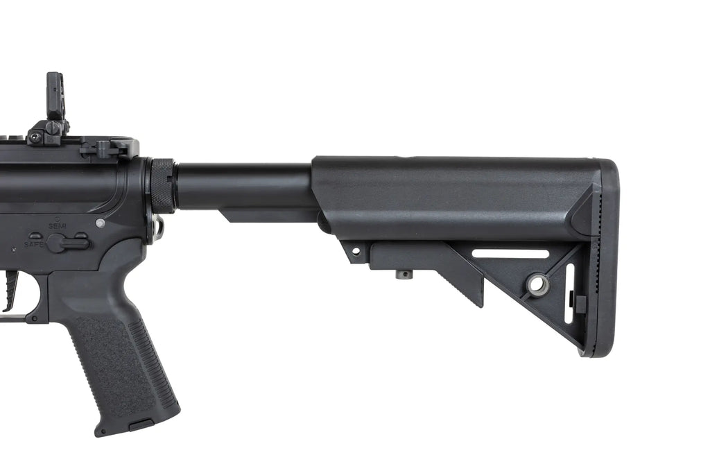 Specna Arms SA-P03 Prime™ HAL ETU airsoft-ase on pistoolikahvaa, flip-up tähtämiä ja vetoperää lukuunottomatta valmistettu kokonaan metallista. Aseen etukädensijana toimii pitkä klassinen KAC mallinen RIS yhteensopiva kiskojärjestelmäsaa. Pakkauksen mukana toimitetaan myös RIS- yhteensopiva vertikaalinen etukahva, jonka voi kiinnittää suoraan etukädensijan alapintaan. Aseen päältä löytyy RIS-yhteensopiva kisko, joka mahdollistaa erilaisten optisten tähtäimien kiinnittämisen aseeseen. Aseen ulkopiipun päästä löytyy 14mm CCW kierteet suuliekinvaimentimen alta äänenvaimentimen tai valojuovalaitteen asentamiseksi.