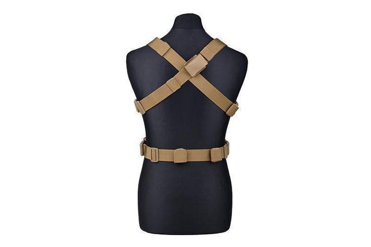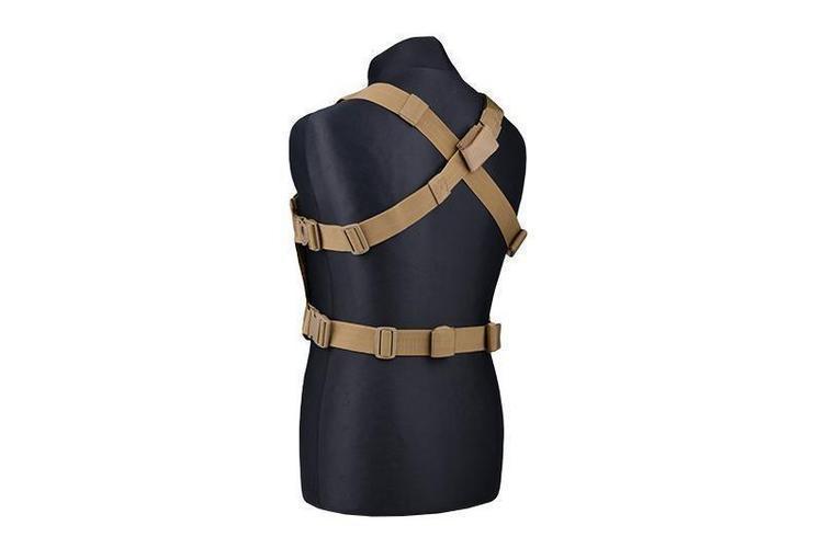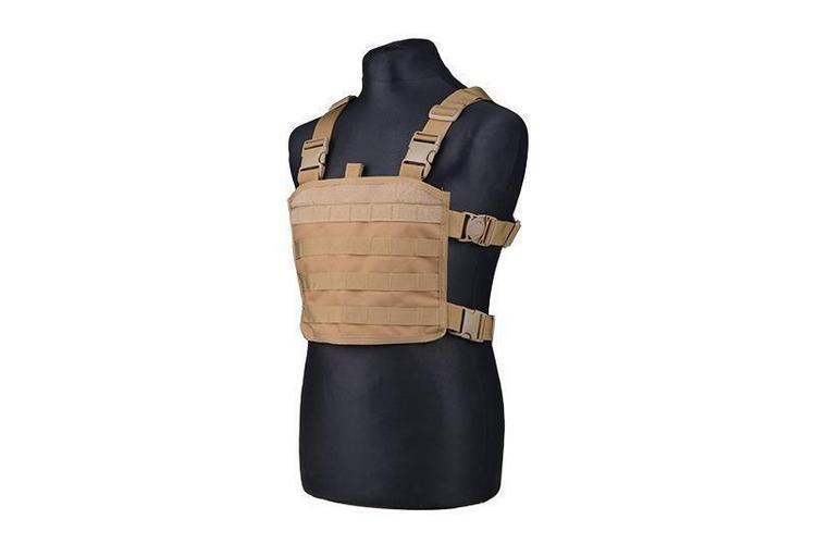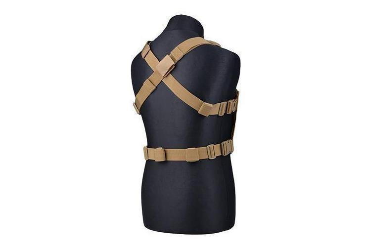 The GFC Mini Chestrig is a MOLLE-based low-profile fully modular vest base. A fully modular vest base means that the vest itself has no pockets at all, but the user can assemble the vest's pocket selection themselves using MOLLE-compatible pockets. The construction of the vest base is simple and lightweight. It consists of shoulder straps that cross over the back, hip straps and a pocket attachment base that is quilted throughout with MOLLE webbing lanes. The top of the attachment base is lined with a velcro surface for attaching personal insignia.