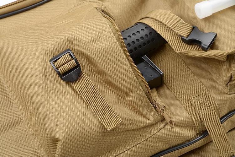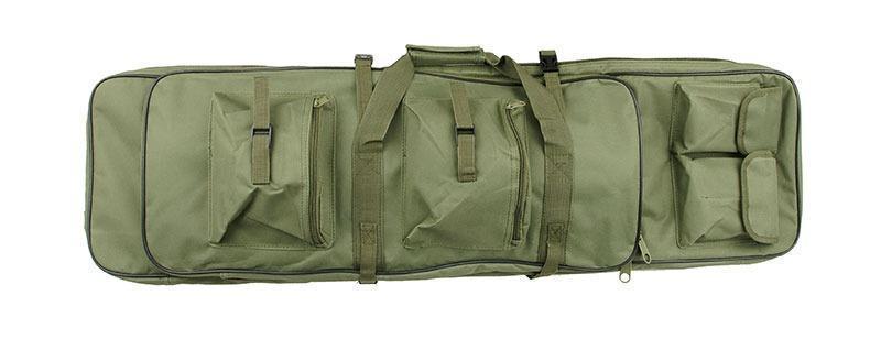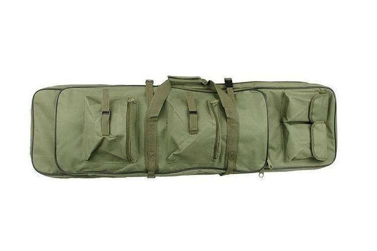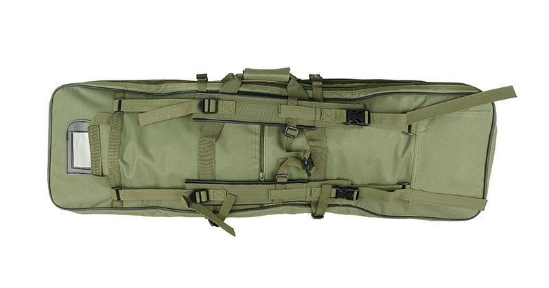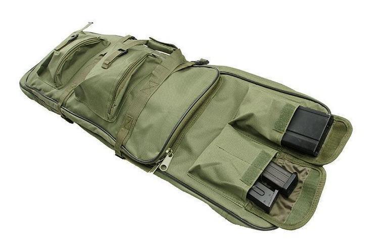 The GFC gun bag is a 960mm long bag made of nylon. Inside the bag there is a fabric bag extension pouch, which allows you to carry 1100mm long weapons completely covered. Inside the largest main pocket there are two separate Velcro strap attachment points for the weapon being carried. On the front of the bag there is another pocket for a smaller weapon, which is 650 mm long and the smaller pocket has two Velcro attachment points for the weapon, like the larger pocket.