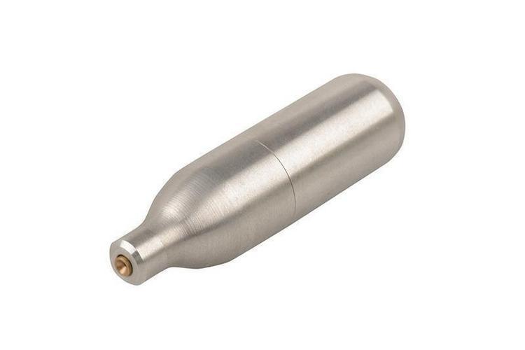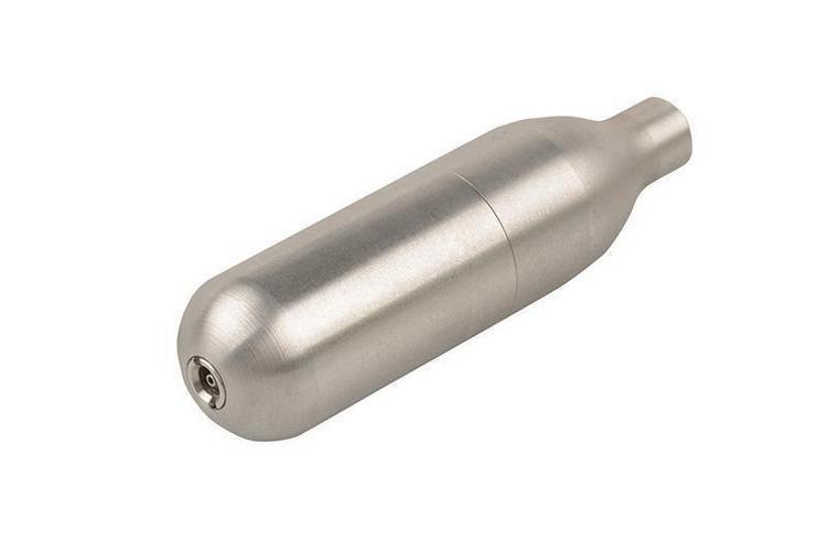 4PPS refillable 8g CO2 capsule. The capsule can be filled with Green Gas bottled gas or carbon dioxide using a filling device via the filling valve found at the bottom of the capsule.
