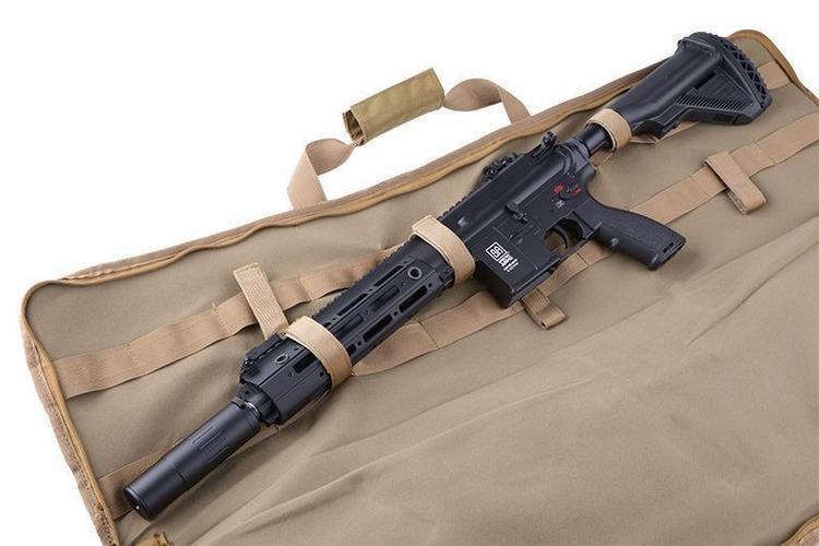 Primal Gear Smilodon I gun case is a high-quality and durable gun case with a wide carrying strap that can accommodate a 950mm long gun. The bag consists of two main sections, the first of which is a pocket that runs the entire length of the bag for storing a long main gun. The second section is a slightly shorter section on the side of the bag, which can be used to store a shorter spare gun or various accessories if necessary. Inside the side section there are three magazine pockets for transporting magazines and various loops to make it easier to keep accessories in order. The side section measures 770 x 220 mm. All walls of the gun case are lined with a soft layer to protect the contents of the gun case from impacts.