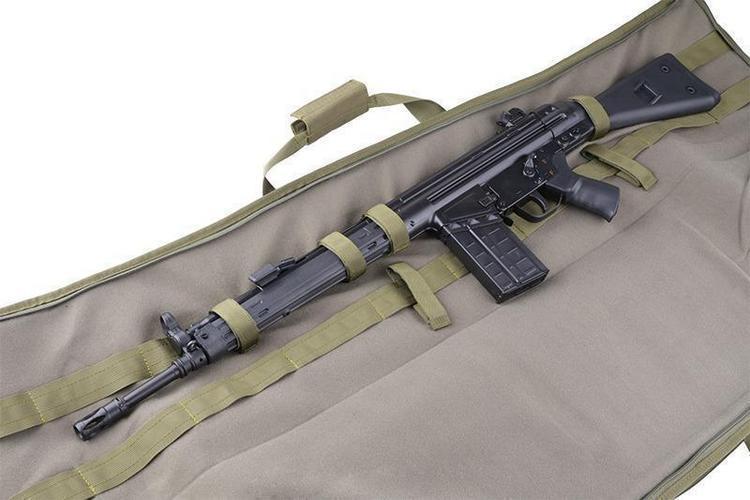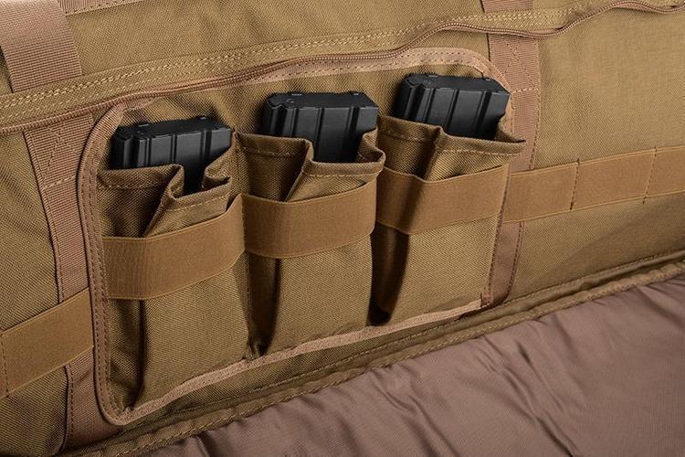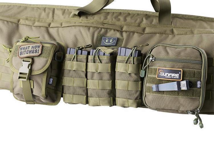 Primal Gear Smilodon II gun case is a high-quality and durable gun case that can accommodate a 1250mm long gun and is equipped with a wide carrying strap. The bag consists of two main sections, the first of which is a pocket that runs the entire length of the bag for storing a long main gun. The second section is a slightly shorter section on the side of the bag, which can be used to store a shorter spare gun or various accessories if necessary. Inside the side section there are three magazine pockets for transporting magazines and various loops to make it easier to keep accessories in order. The side section is 900 x 220 mm in size. All walls of the gun case are lined with a soft layer to protect the contents of the gun case from impacts.