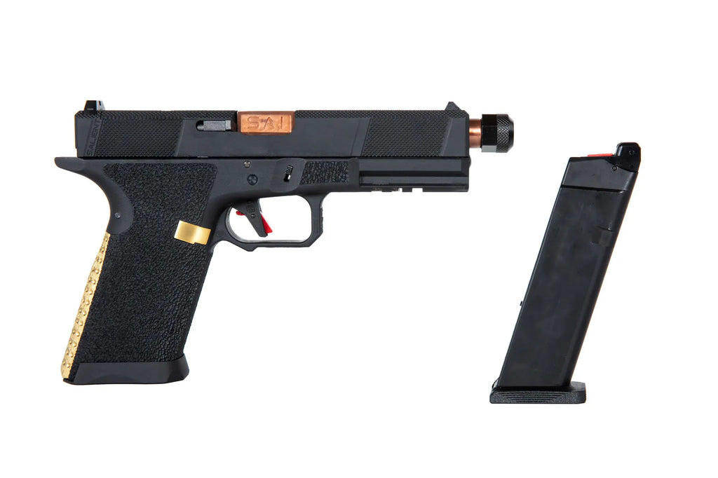 The Specna Arms / EMG SAI BLU GBB pistol is the result of a collaboration between Specna Arms, known for its electric weapons, and EMG Arms, and Salient Arms International ™. Salient Arms International ™ is a well-known American firearms manufacturer whose heavily modified Glock-style pistol serves as the prototype for the SAI BLU airsoft pistol.