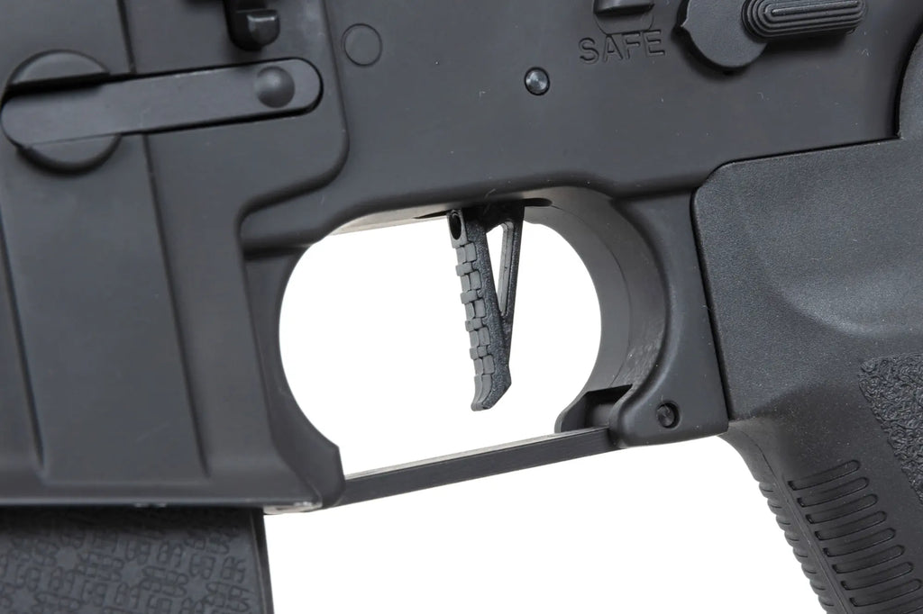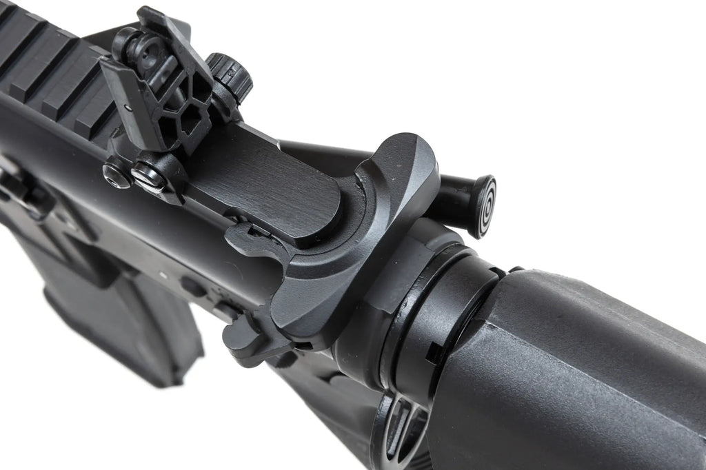 The EDGE series of electric guns are metal-framed airsoft replicas equipped with exceptionally high-quality mechanisms for their price range. The SF-type rear sight, which provides the weapon's large battery compartment, the foregrip and the pistol grip are made of nylon fiber-reinforced polymer plastic. The frame, rail system, barrel, muzzle flash suppressor, charging handle and sling loops are made of metal.