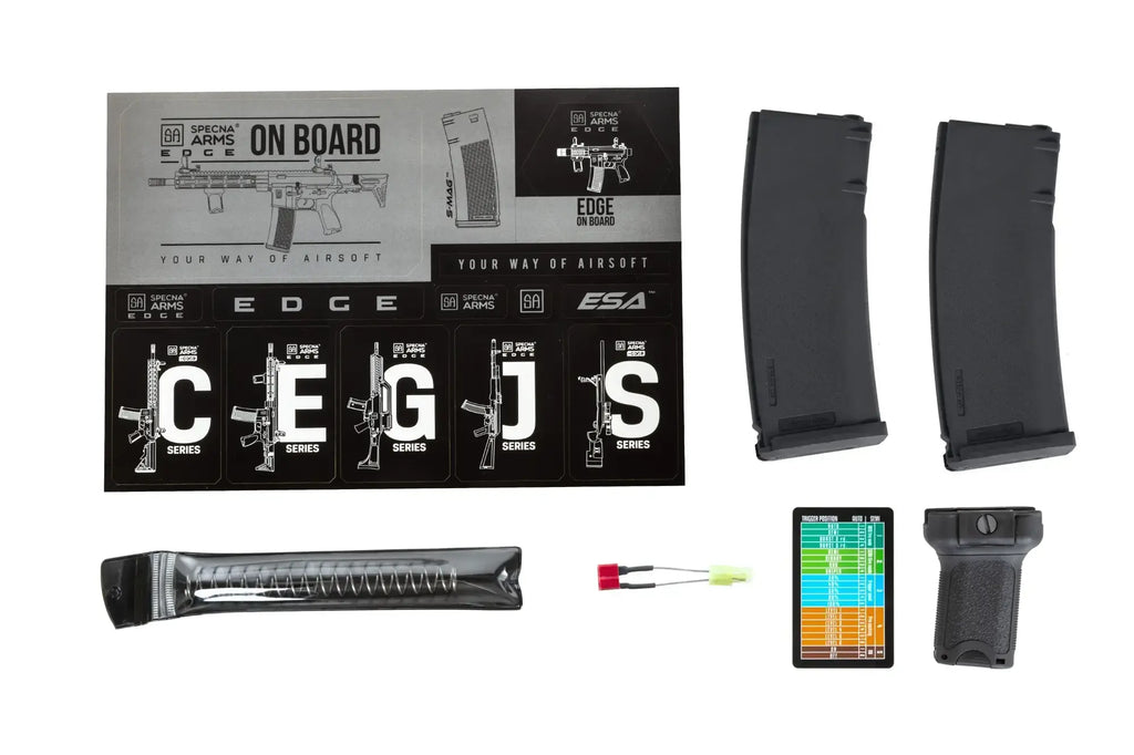 EDGE airsoft guns are designed to work with 7.4-11.1V LiIon, LiPo and LiFe batteries. The factory-installed spring provides a muzzle velocity of approximately ~116m/s with a 0.20g bullet. An M90-type spring is also included, which allows for a lower muzzle velocity of approximately ~90m/s with a 0.20g bullet, making the gun a perfect choice for indoor arenas as well.