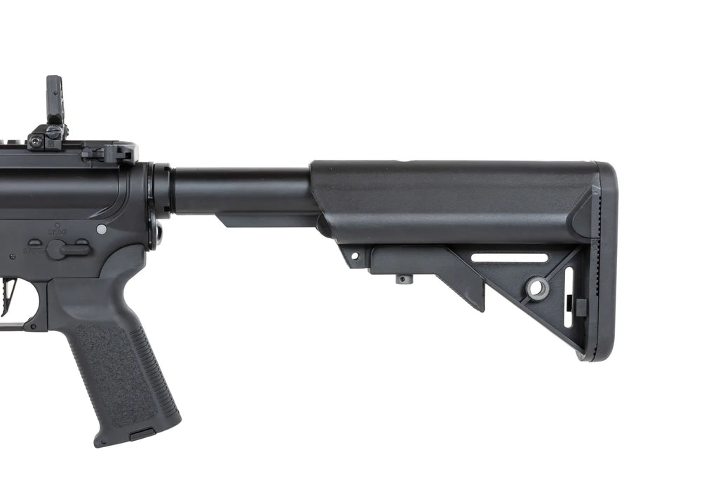 Specna Arms RRA SA-E03 EDGE™ HAL ETU™ carbine is a metal-framed AR-15 variant equipped with a classic KAC RIS-style rail system. It is possible to attach a variety of tactical accessories to the rail system, such as weapon lights, grips, laser or optical sights. The package includes 2 plastic rail protectors and a tactical vertical front grip. The top of the weapon has a long picatinny / RIS rail for attaching separately sold optical sights directly to the rail. The end of the weapon's outer barrel has standard negative 14mm threads (14mm CCW) for attaching suppressors.
