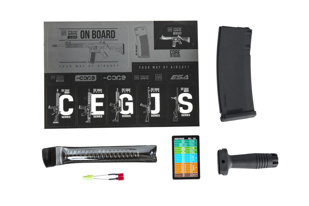 CORE airsoft guns are designed to work with LiIon, LiPo and LiFe batteries. The factory-installed spring provides a muzzle velocity of approximately ~116m/s with a 0.20g bullet. An M90-type spring is also included, which allows for a lower muzzle velocity of approximately ~90m/s with a 0.20g bullet, making the gun a perfect choice for indoor arenas as well.