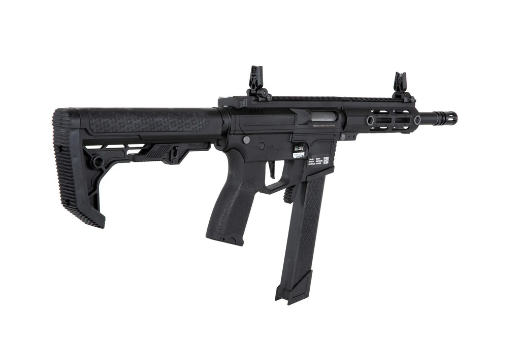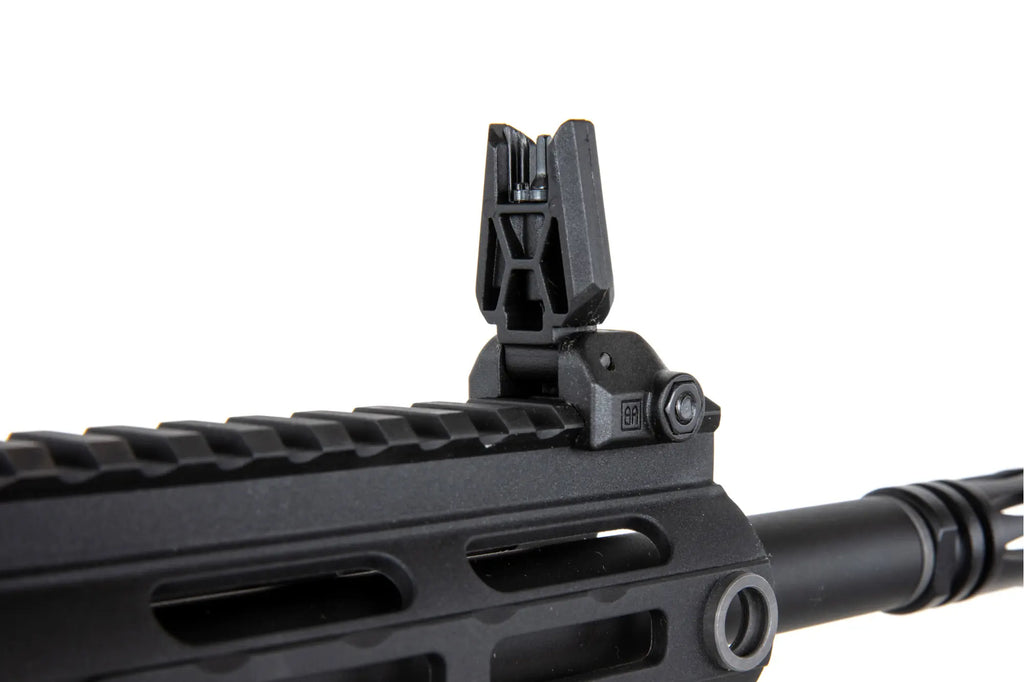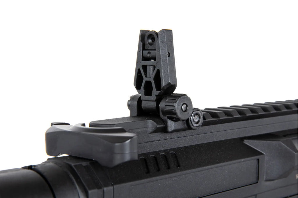 The SA-FX01 body is made of nylon fiber reinforced plastic, which makes the weapon very sturdy compared to traditional plastic-bodied airsoft weapons. The SA-FX01 is equipped with an M-LOK compatible foregrip, on the upper surface of which a standard RIS rail runs. At the end of the outer barrel of the weapon there are standard 14mm CCW threads to which a metal flame arrester is screwed. The flame arrester is easy to remove and replace with, for example, a light strip device or a silencer. On top of the weapon there are iron sights that fold out of the way if necessary.
