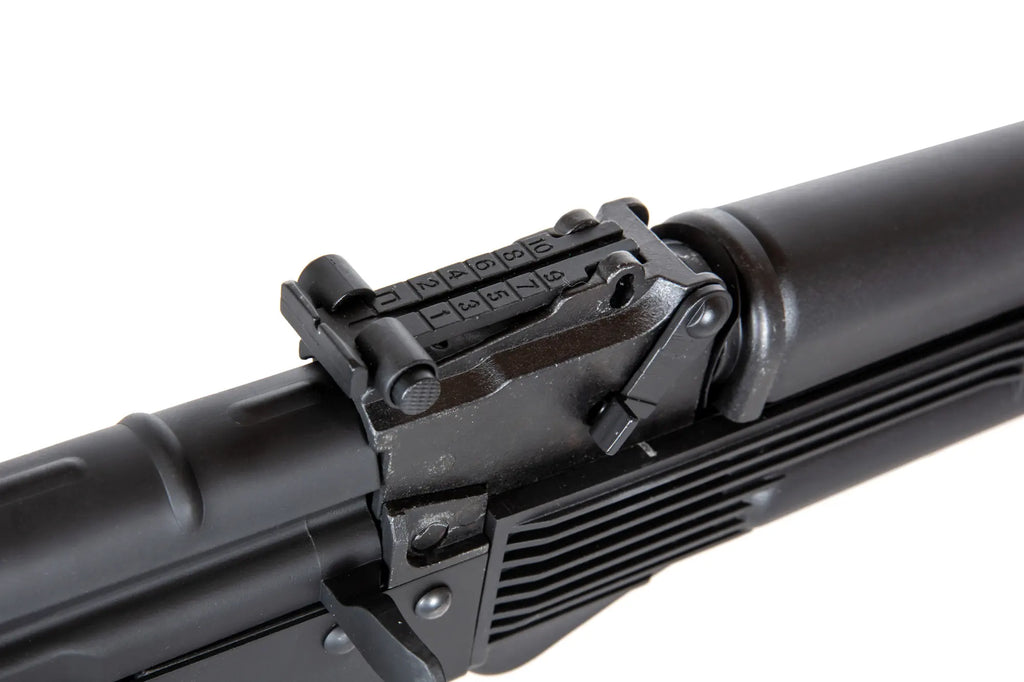 The frames of the Specna Arms J-Series™ AK airsoft guns are made mainly of steel. In addition to the frame, the receiver cover, outer barrel, trigger guard, magazine release, fire selector, gas tube guard, flame arrester, stock strap mounts, rear sight, cleaning stick, stock mounts and other small parts are also made of steel. The remaining metal parts are cast from zinc-reinforced aluminum, which is coated with a fine coating that gives a realistic appearance. The pistol grip, grips and supports use various polymers, similar to the prototype firearms.