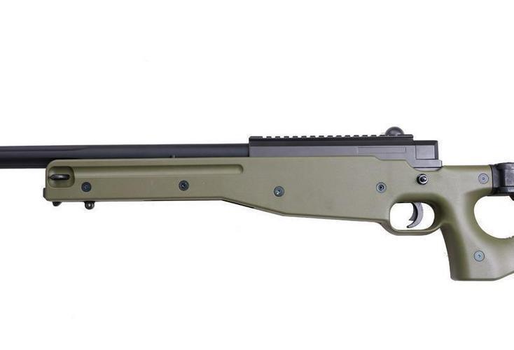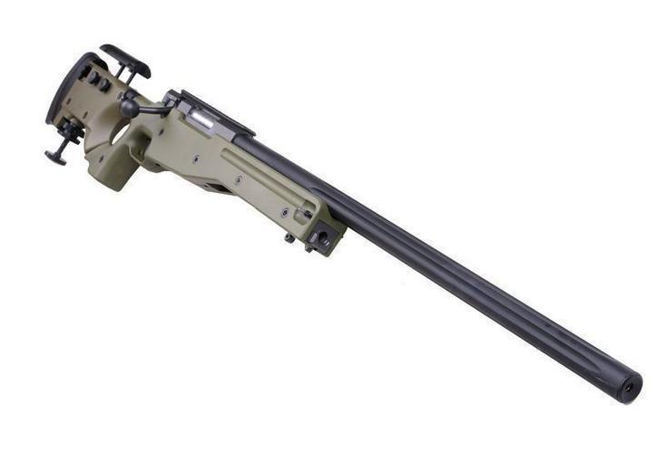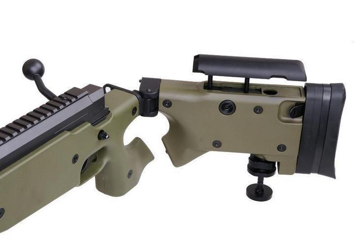 Well MB08 is a folding stock airsoft sniper rifle made of metal, except for the stock. The MB08 polymer stock is adjustable according to the user's own preferences and dimensions, both in terms of the length of the stock and the height of the cheekpiece. The weapon has three metal attachment points for the carrying strap, which are located next to the stock, at the folding point of the folding stock and at the attachment point of the front legs. The weapon's polymer stock has a hinge point at the pistol grip, which allows the weapon to be folded in two for easier transport or movement in tight spaces.