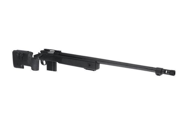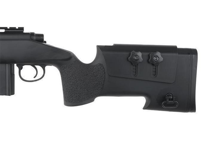 Well MB4416A is a sturdy single-shot spring-action rifle with a realistically positioned magazine. The stock of the weapon is made of durable polymer and the other external parts are made of metal. The butt of the weapon has an adjustable cheek piece and a comfortable rubber butt plate. On top of the weapon there is a standard 22 mm universal RIS rail for attaching a telescopic sight. On the front of the stock, below the weapon, there is also a corresponding rail for the forelegs. In addition to accessories that can be attached to the rail, the stock of the weapon has round slots suitable for QD quick-release belt loops for installing carrying sleeve attachments.
